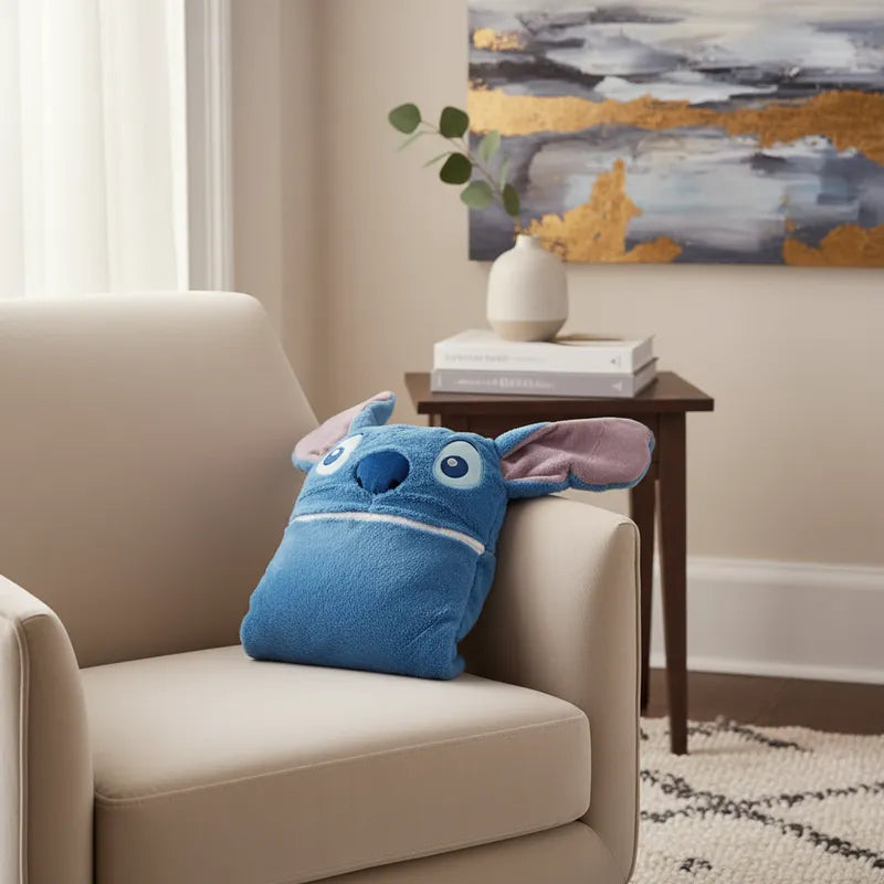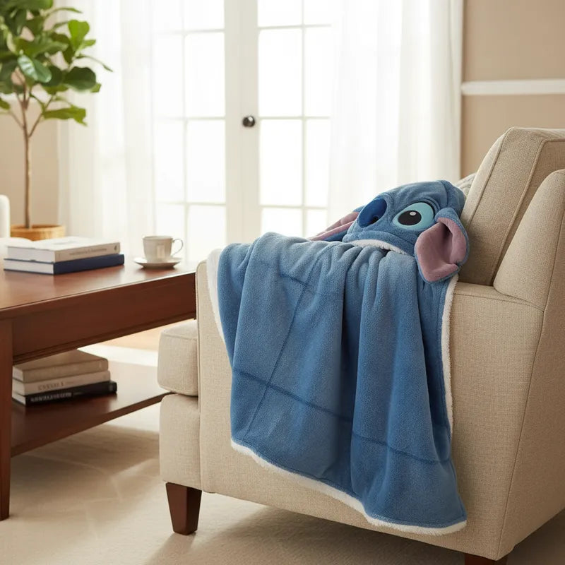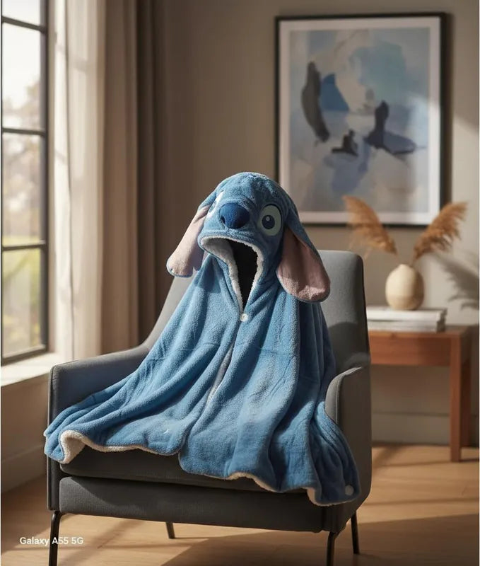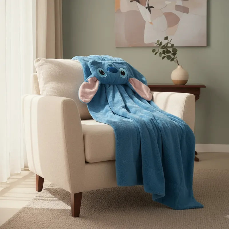 Disfruta del confort y calidez con esta frazada con capucha de stitch aborregada. Su textura suave y abrigadora te envuelve, haciendo que sea ideal para los días fríos o para relajarte en casa. Perfecta para mantener el calor mientras añades un toque acogedor a tus momentos de descanso.